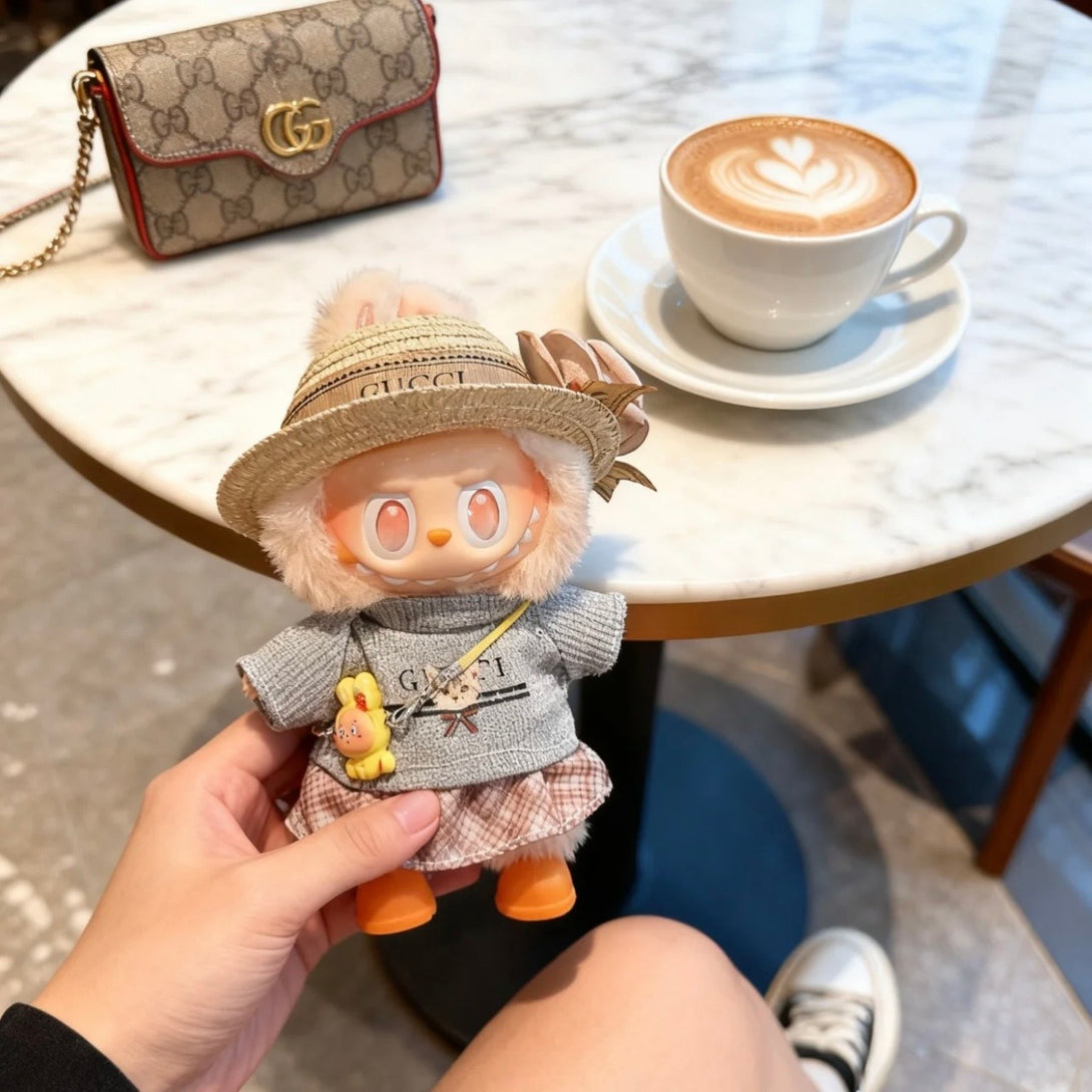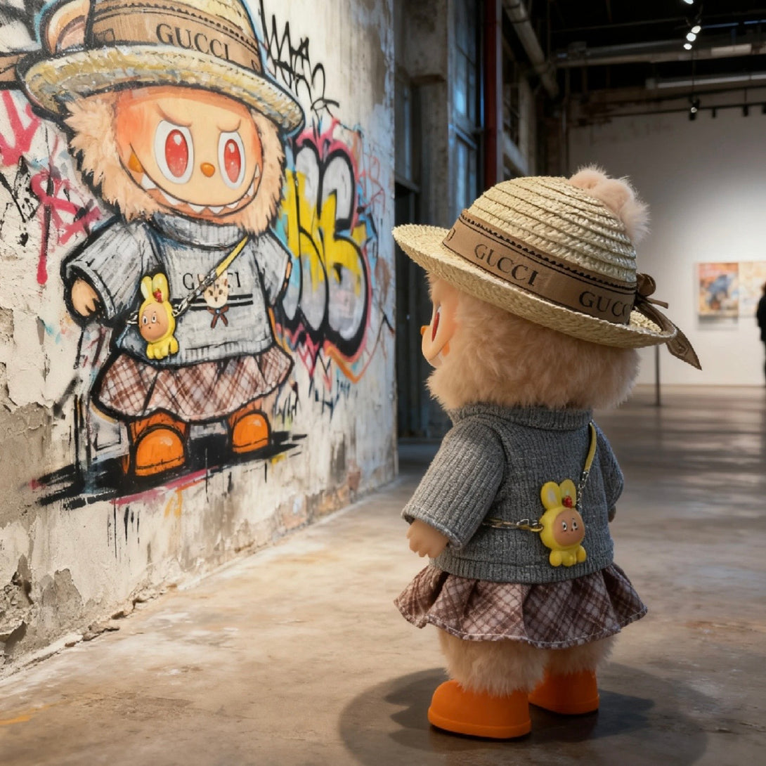 The look is finished with a woven straw hat adorned with a bow, giving your BUBU a charming, vintage-inspired vibe. 🧺 Whether you’re taking photos in a café, at a gallery, or on a city stroll, this outfit turns your BUBU into a true little trendsetter! ✨