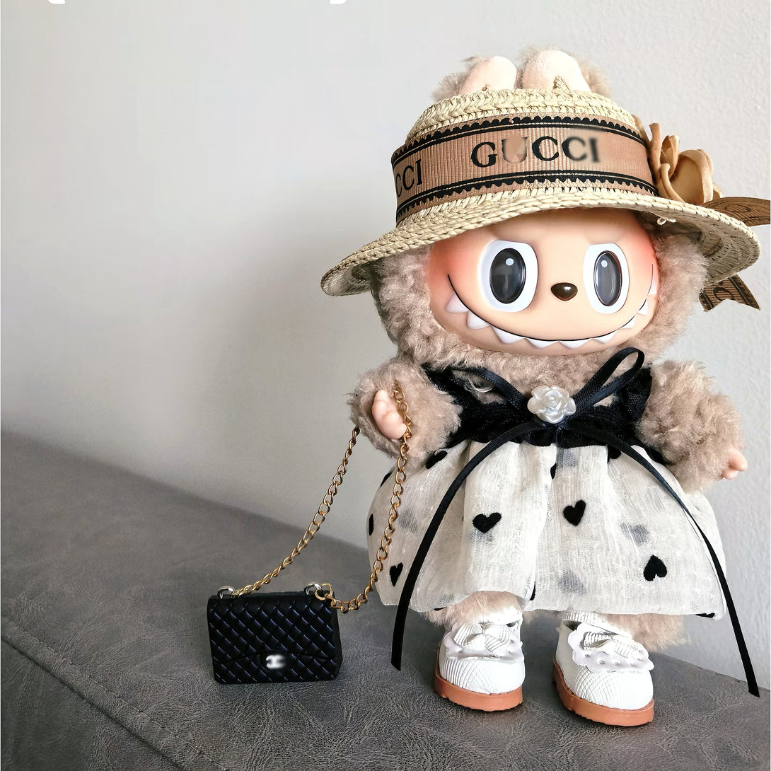 Turn heads at any imaginary garden party with this effortlessly elegant look for your BUBU. Featuring a romantic heart-print mesh dress cinched with a velvet bow, a wide-brimmed straw hat with floral accents, and a quilted mini purse on a gold chain, this outfit channels timeless high fashion with playful charm.