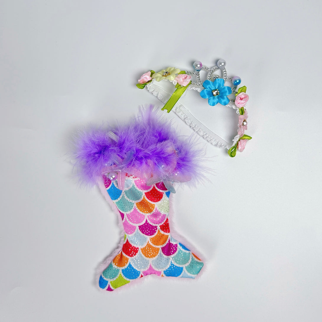 This dazzling outfit features a shimmering pastel mermaid tail covered in rainbow scales, soft fluffy trim, starfish accents, and a glamorous pink hood with floral details. And of course, no royal undersea look is complete without a sparkling jeweled tiara to crown the ensemble.