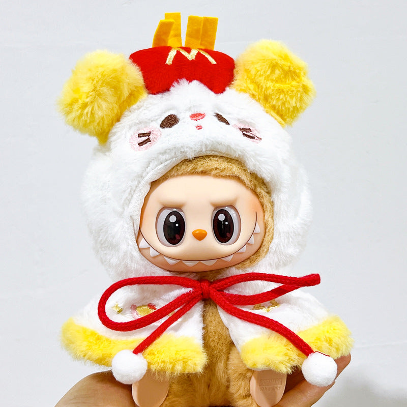 Give your BUBU a playful fast-food twist with our French Fries Cape! This quirky and cozy outfit features a fluffy hood with cute bear ears, embroidered face details, a bright red bow tie, and a fun “fries box” style top. Available in brown or yellow, it’s the perfect mix of adorable and hilarious — guaranteed to make your plush stand out.