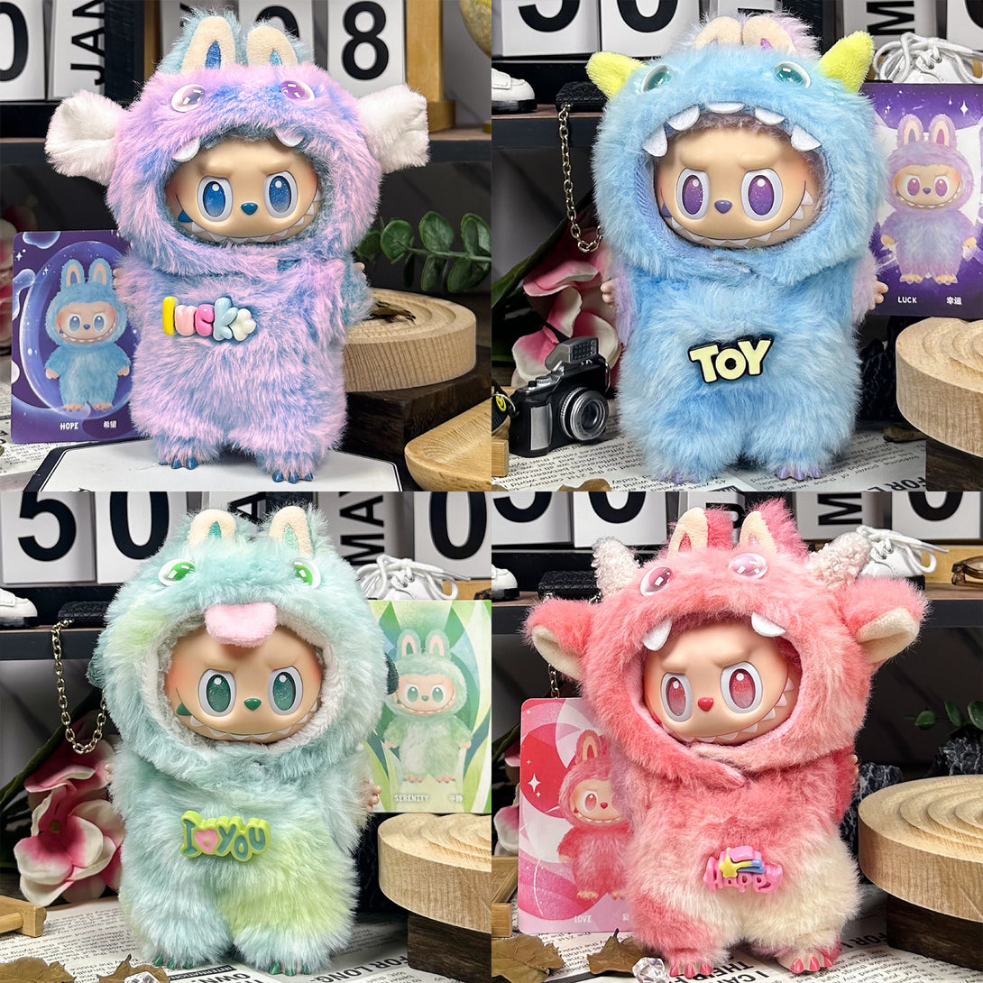 This 2-piece outfit includes a fluffy pastel monster hood with big ears and a matching fuzzy jumpsuit decorated with playful lettering. Available in 7 fun colors, it’s soft, vibrant, and guaranteed to make your plush stand out with whimsical charm.