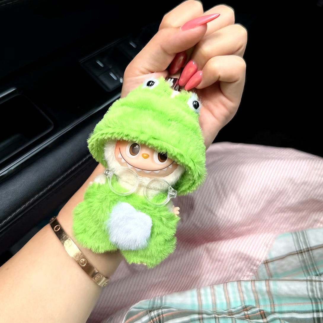 Dress your mini BUBU in this irresistibly fuzzy frog suit featuring a bright green plush body, heart-shaped belly patch, and a hood topped with googly frog eyes and tiny ear nubs. It's the perfect mix of quirky and cute — ideal for springtime strolls, silly shelf poses, or as a standout plush keychain.