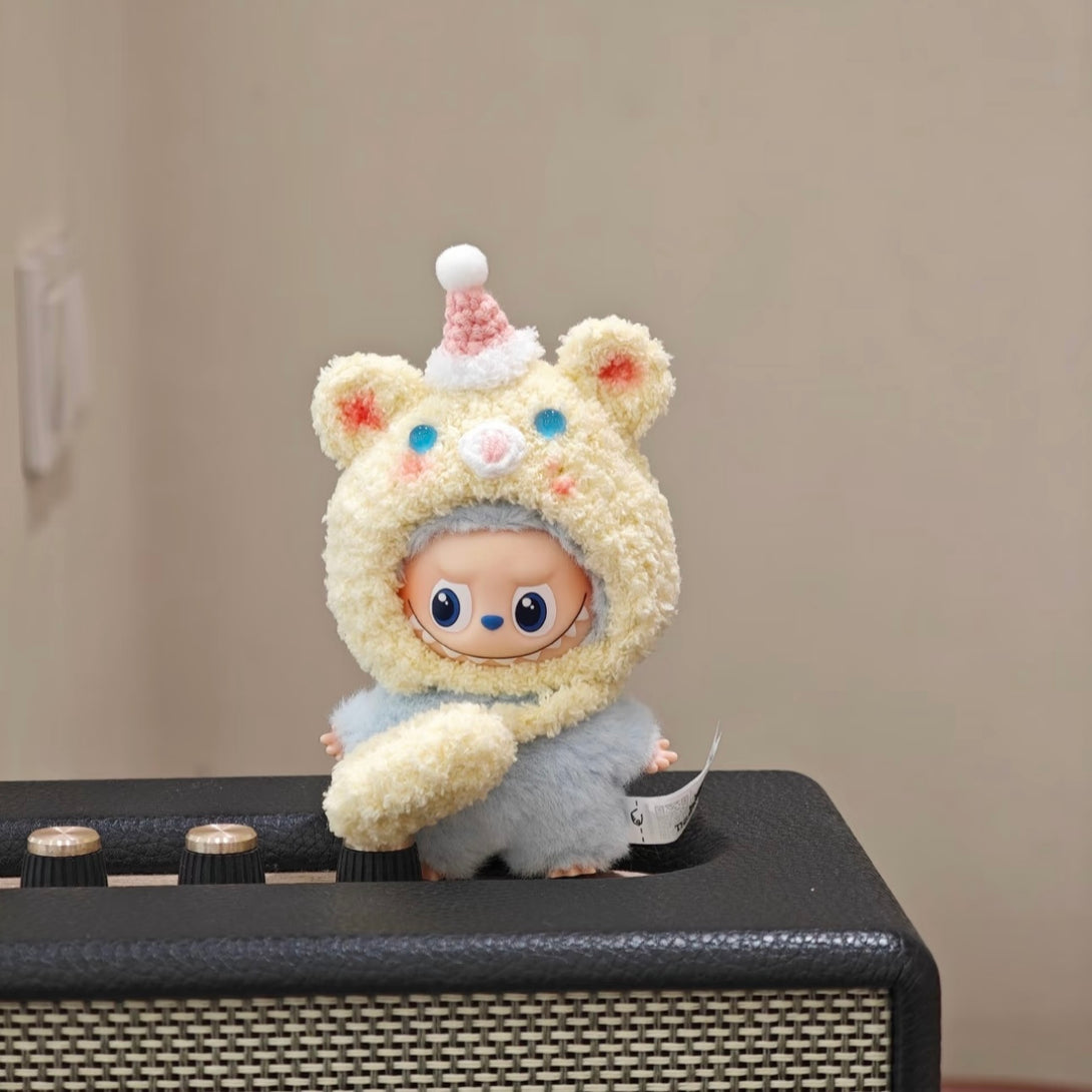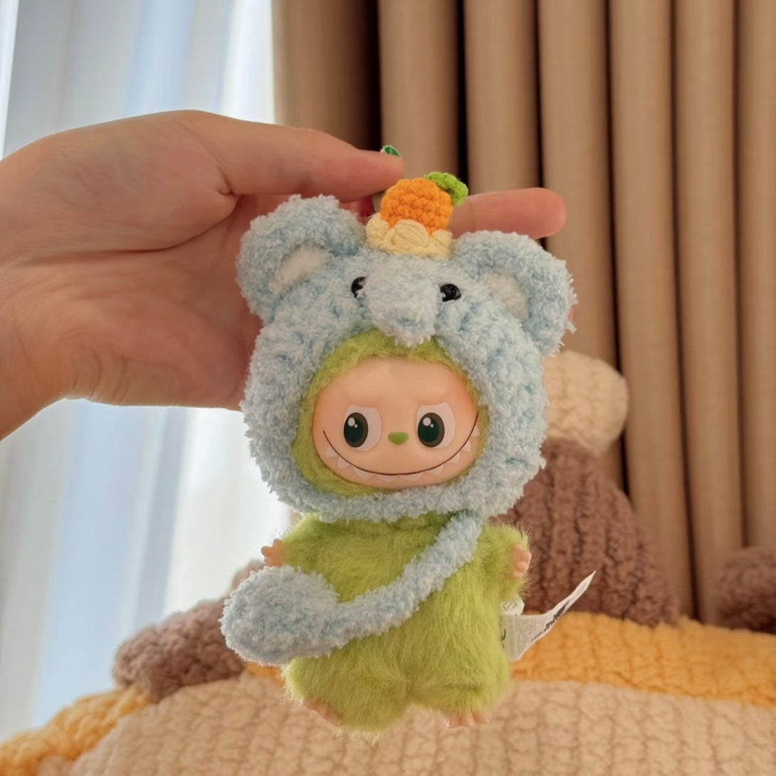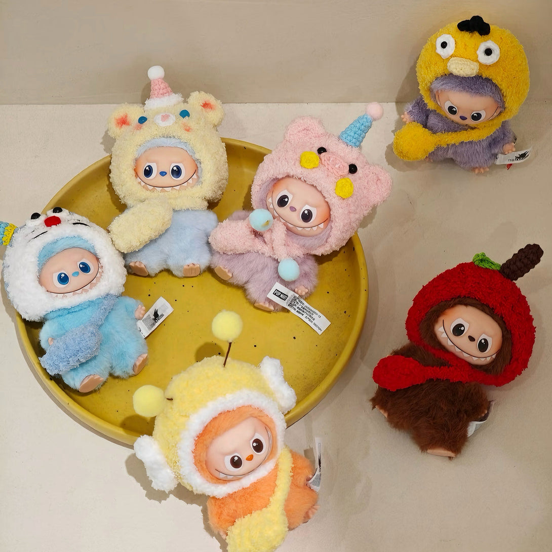 This handmade fuzzy hood set dresses your mini BUBU in whimsical characters — from party bears to fruity critters — each outfit crafted with ultra-soft plush, playful ears or antennas, and an adorable mini backpack to complete the look.