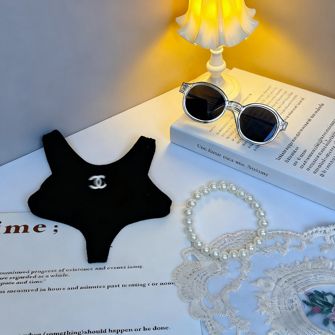 This sleek black one-piece swimsuit features a cute pearl necklace detail for a touch of elegance, while the cool sunglasses bring major vacation attitude.