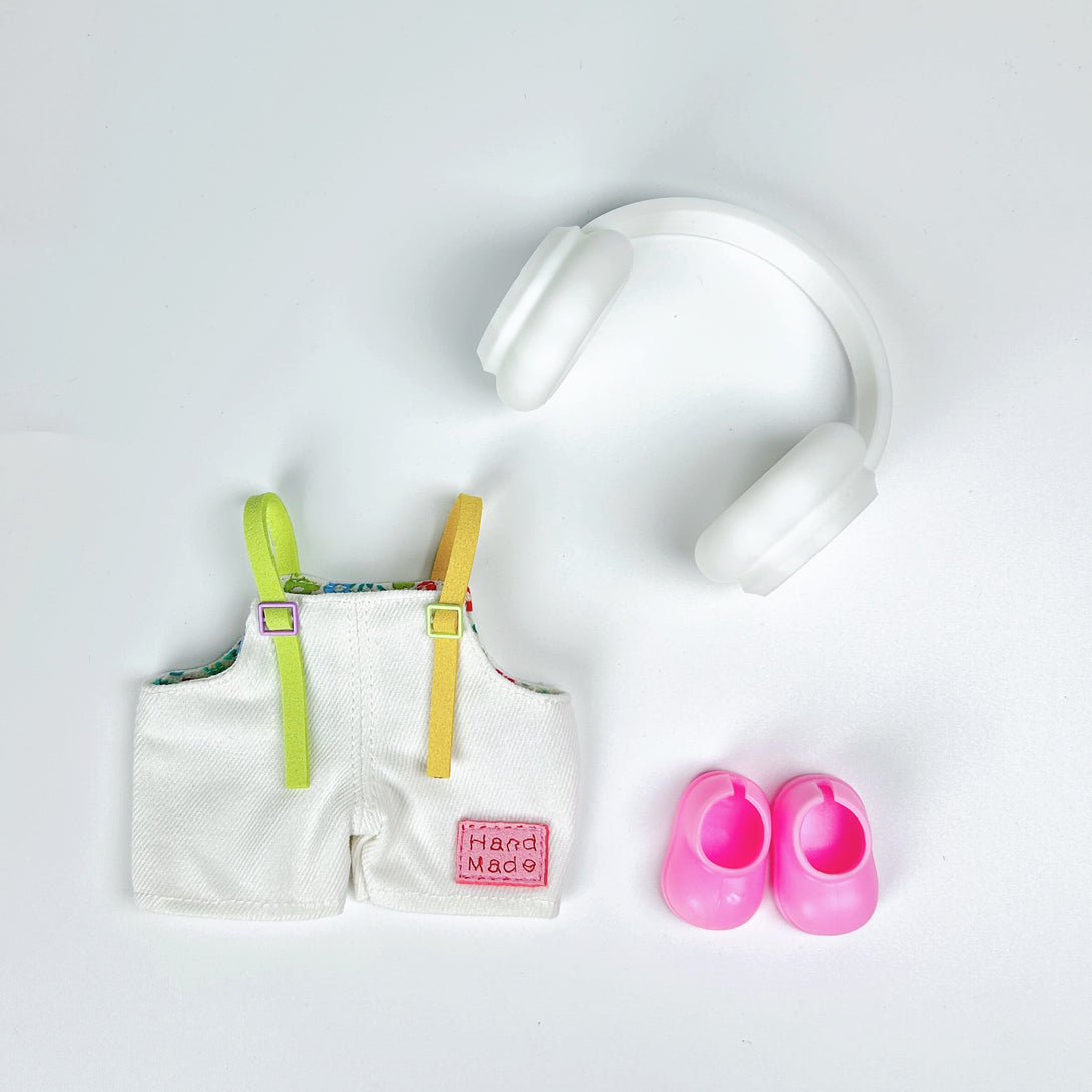 • Includes: White overalls with green & yellow straps, pink boots, and white headphones accessory (no inner top)
