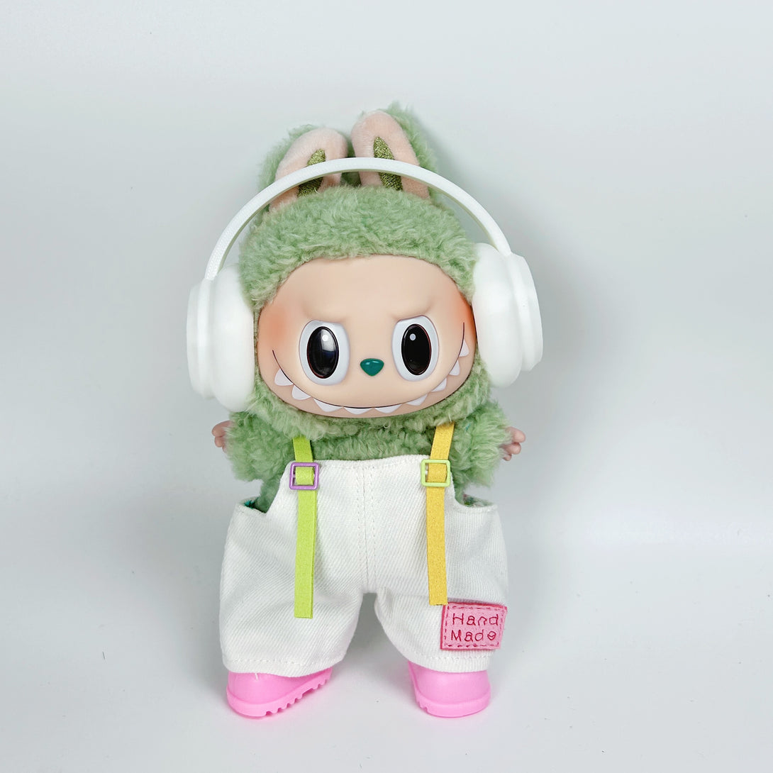 This fun look features crisp white overalls with mismatched colorful straps — one in bright green, the other in sunny yellow — paired with statement white headphones that instantly give off cool street vibes. Finished with pastel pink boots and a cute "Hand Made" patch detail, this outfit is all about bold personality and carefree charm.