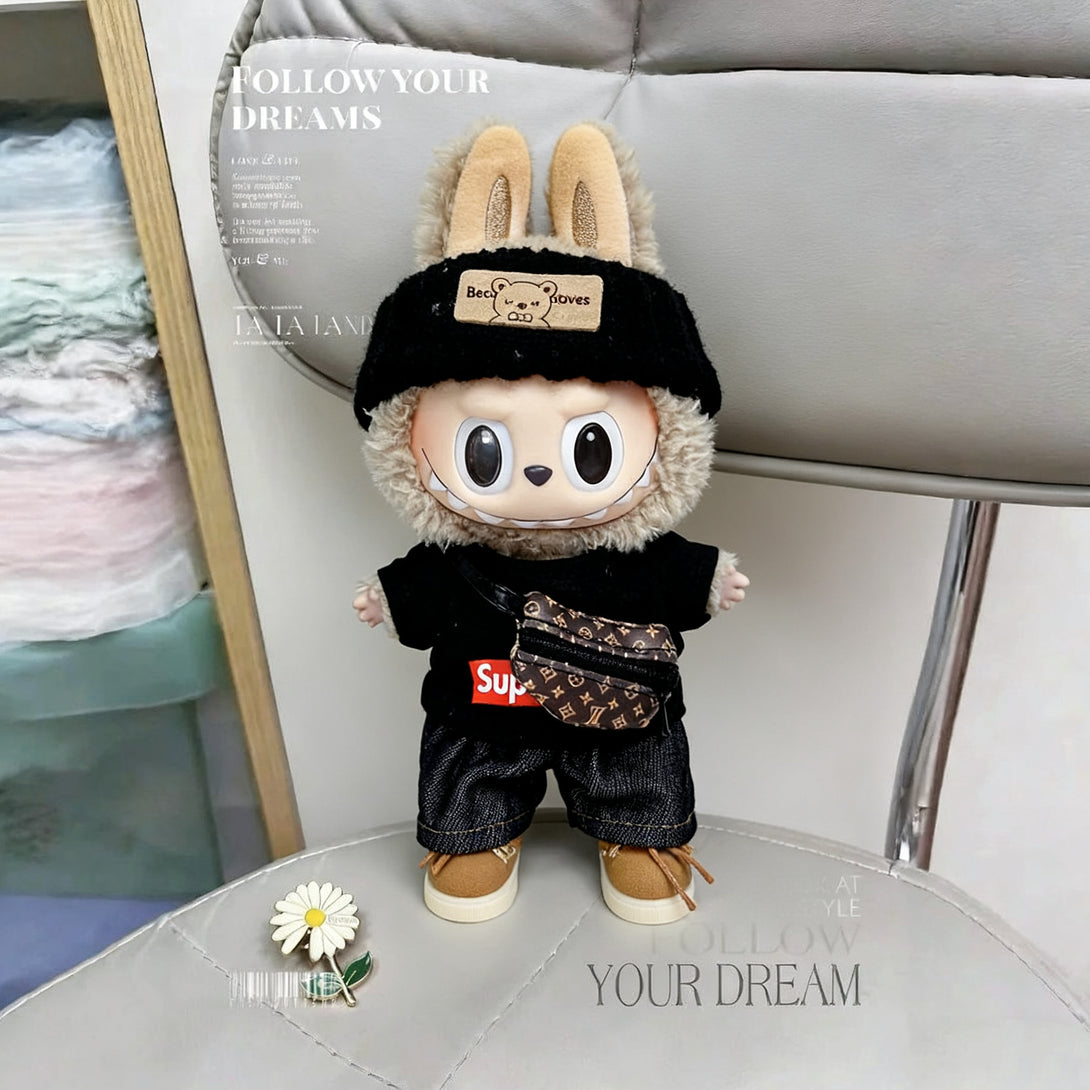This 5-piece outfit brings together urban cool and designer-inspired flair — featuring a bold red-box logo tee, mini monogram crossbody bag, cuffed jeans, knit beanie with ear cutouts, oversized glasses, and sturdy boots. It’s high-end streetwear, BUBU-style.