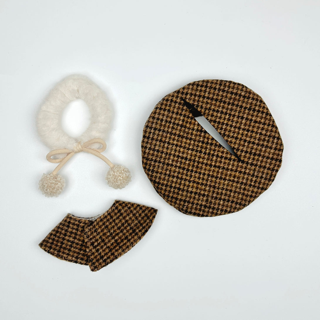 The brown plaid pattern adds a vintage touch, while the soft fur scarf brings a snuggly vibe — perfect for creating a warm, layered look. Each piece is designed to be easy to put on and style, making it great for daily displays or photo sessions.