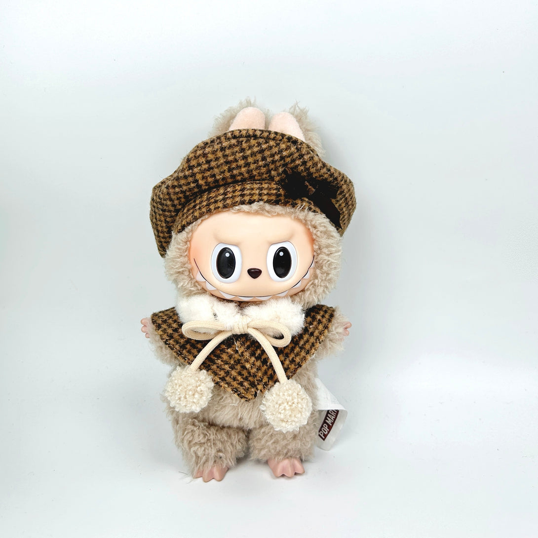 Give your BUBU a cozy, retro-inspired autumn look with this charming three-piece set. Featuring a classic checkered beret, matching mini cloak, and a fluffy tie scarf with playful pompoms, this outfit instantly transforms your plush friend into an adorable little traveler ready for crisp city strolls or a warm café date.