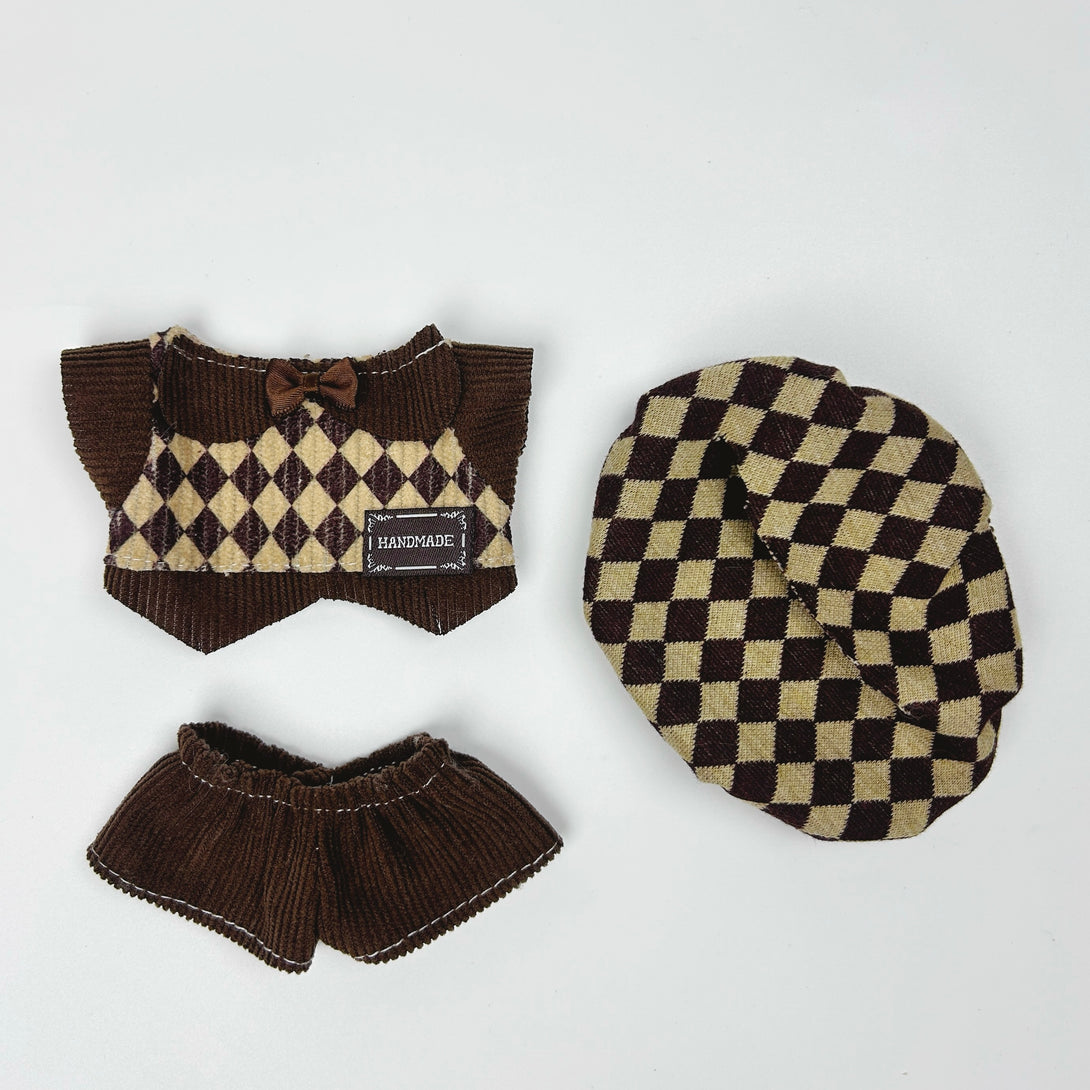 This nostalgic ensemble includes a diamond-patterned sweater vest, puff-sleeve shirt, matching beret, and adorable knicker-style pants, all in warm brown tones. It transforms your BUBU into the cutest little bookworm or mini detective in town.